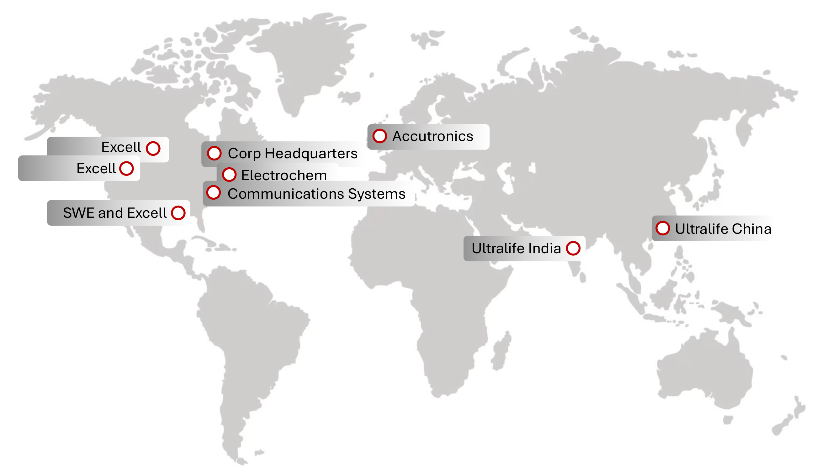 Ultralife has Centers of Excellence in North America, Europe and Asia. Our strategic investments and acquisitions have expanded our capabilities and global reach, and our ability to serve multinational customers with product development, support and logistics. Our global footprint and commitment to quality ensure we have engineering and technical capabilities for local support, manufacturing excellence and redundancy, a robust supply chain and integrated program management and communication.